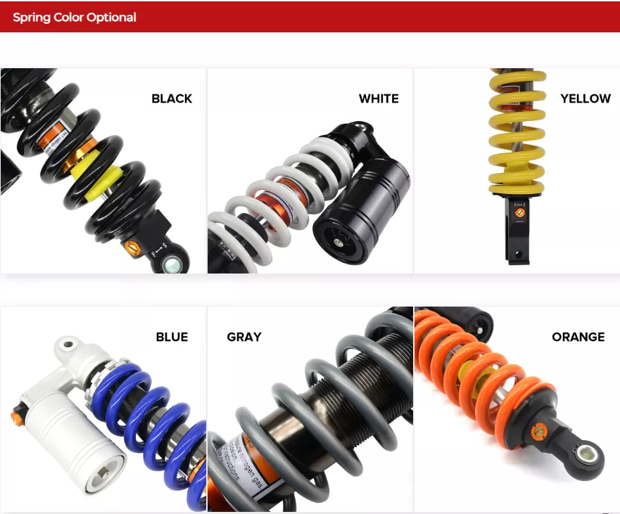 O absorvedor de choque de motocicleta de 280 mm externo inclui uma válvula de escape para controlar a formação de gás no óleo durante longos períodos de condução, garantindo o desempenho ideal de amortecimento. Se não houver gás insuficiente no amortecedor de choque, ele poderá ser preenchido com 0,7-0.8MPa de ar para manter a função consistente e a qualidade do passeio.